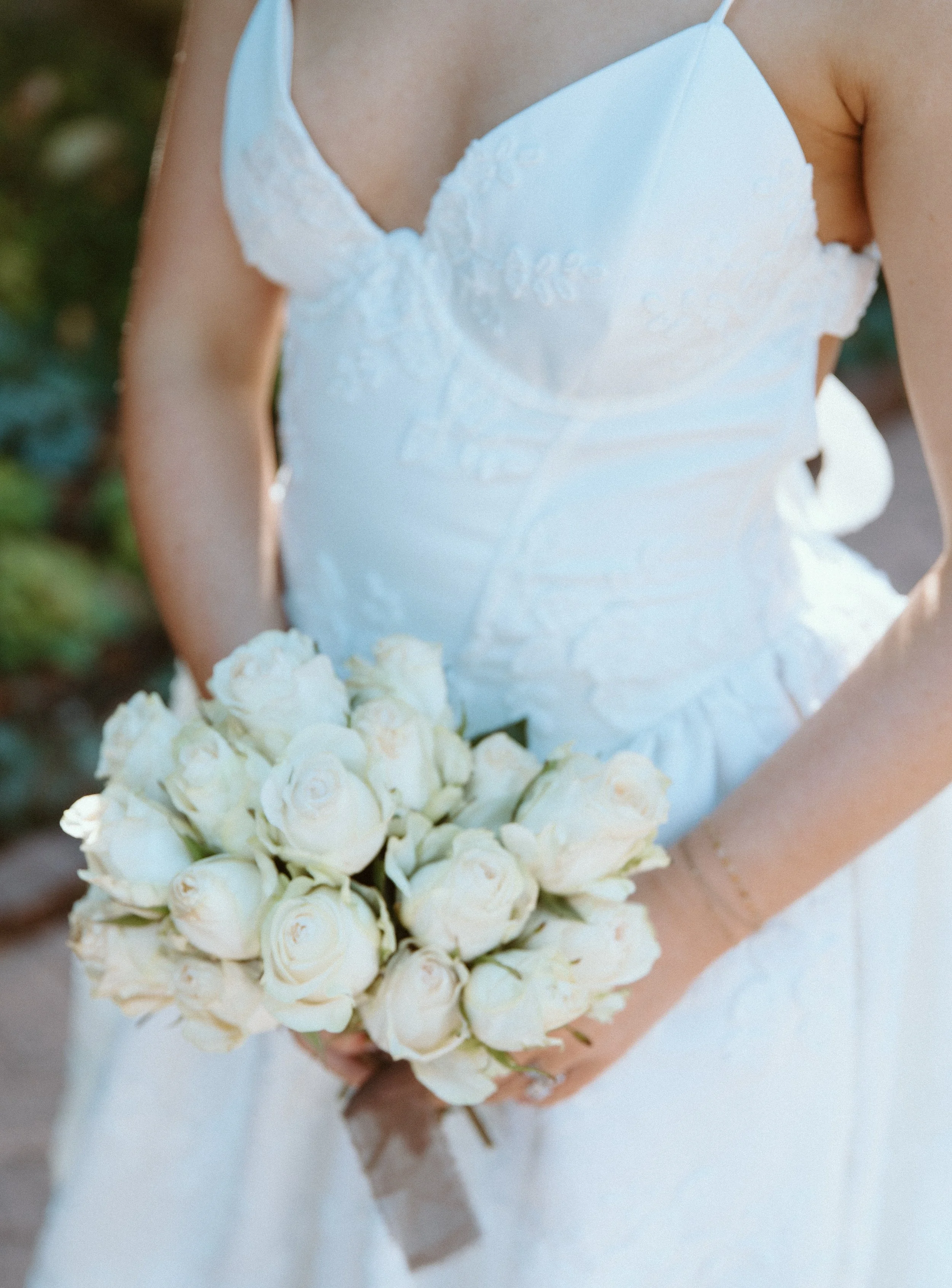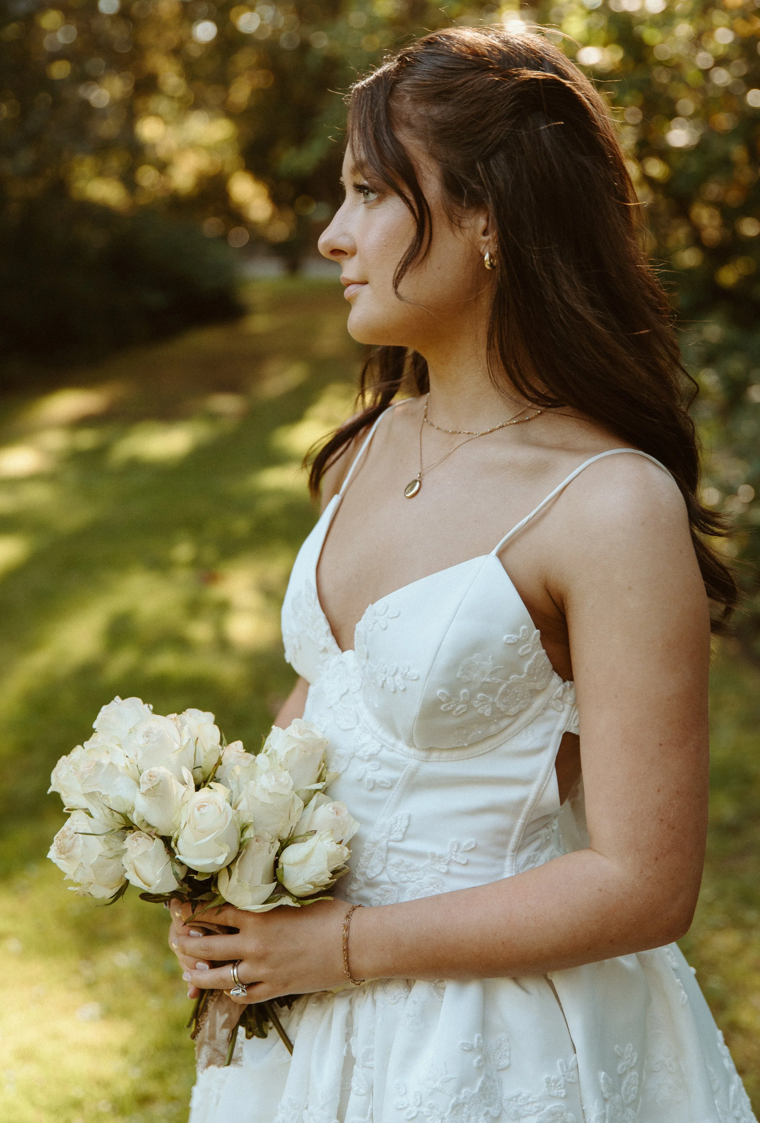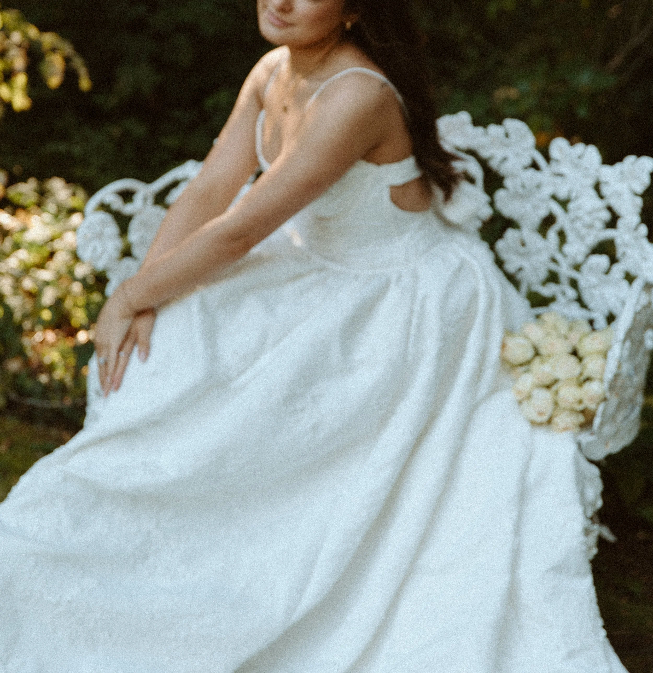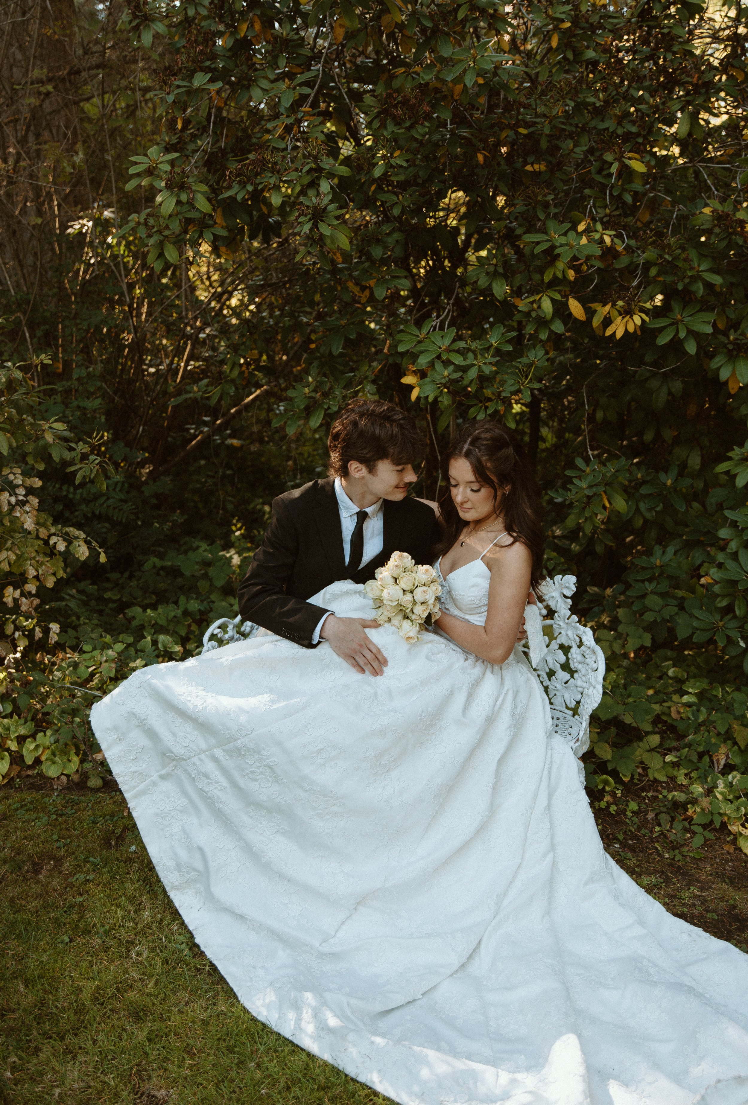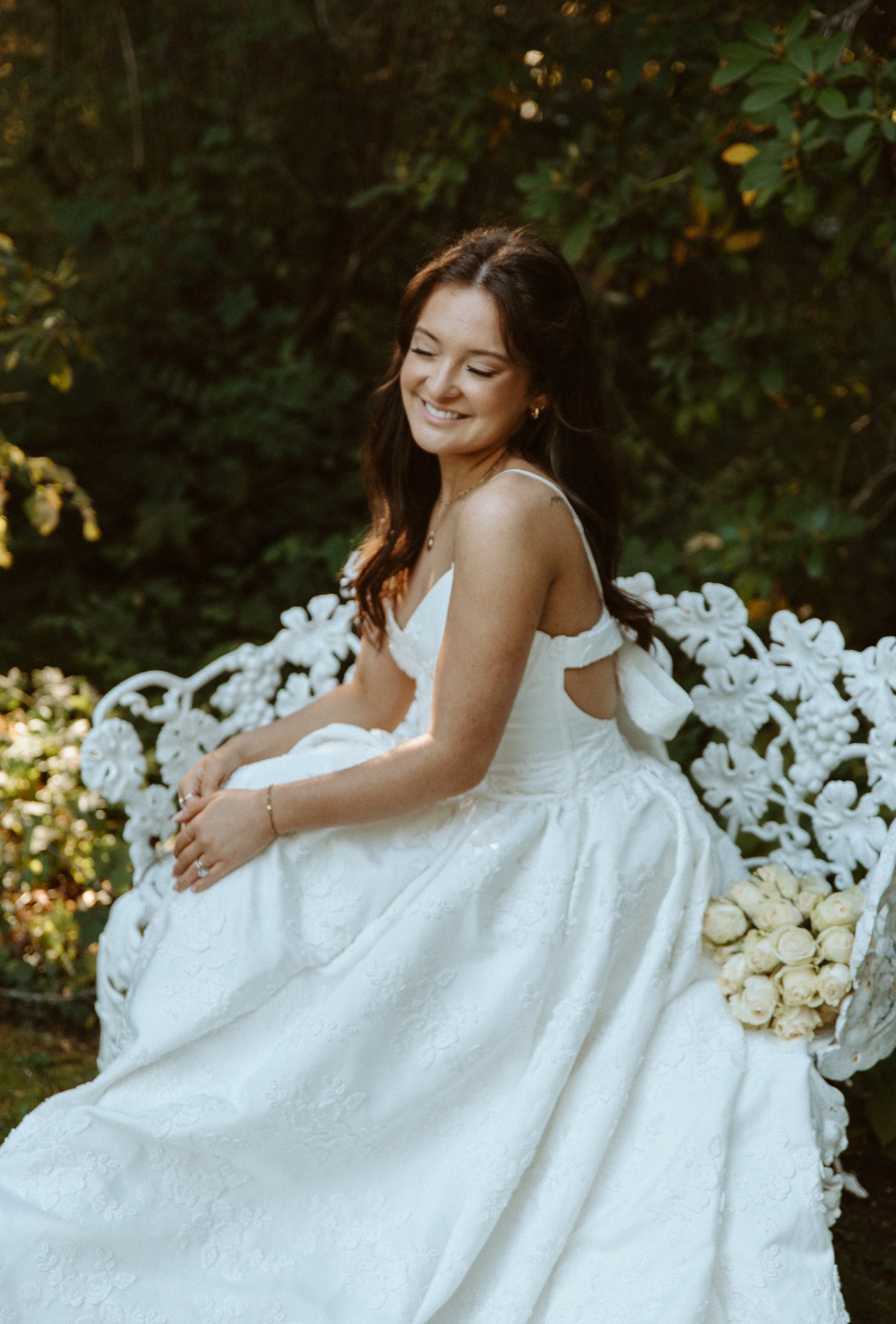 The bouquet was designed with all white roses, creating a clean, elegant, and timeless look. Against the warm tones of fall at Lakewold Gardens, the white roses brought a soft brightness that stood out beautifully in every shot. The simplicity of the bouquet allowed the gown’s floral details and the natural beauty of the gardens to shine.
