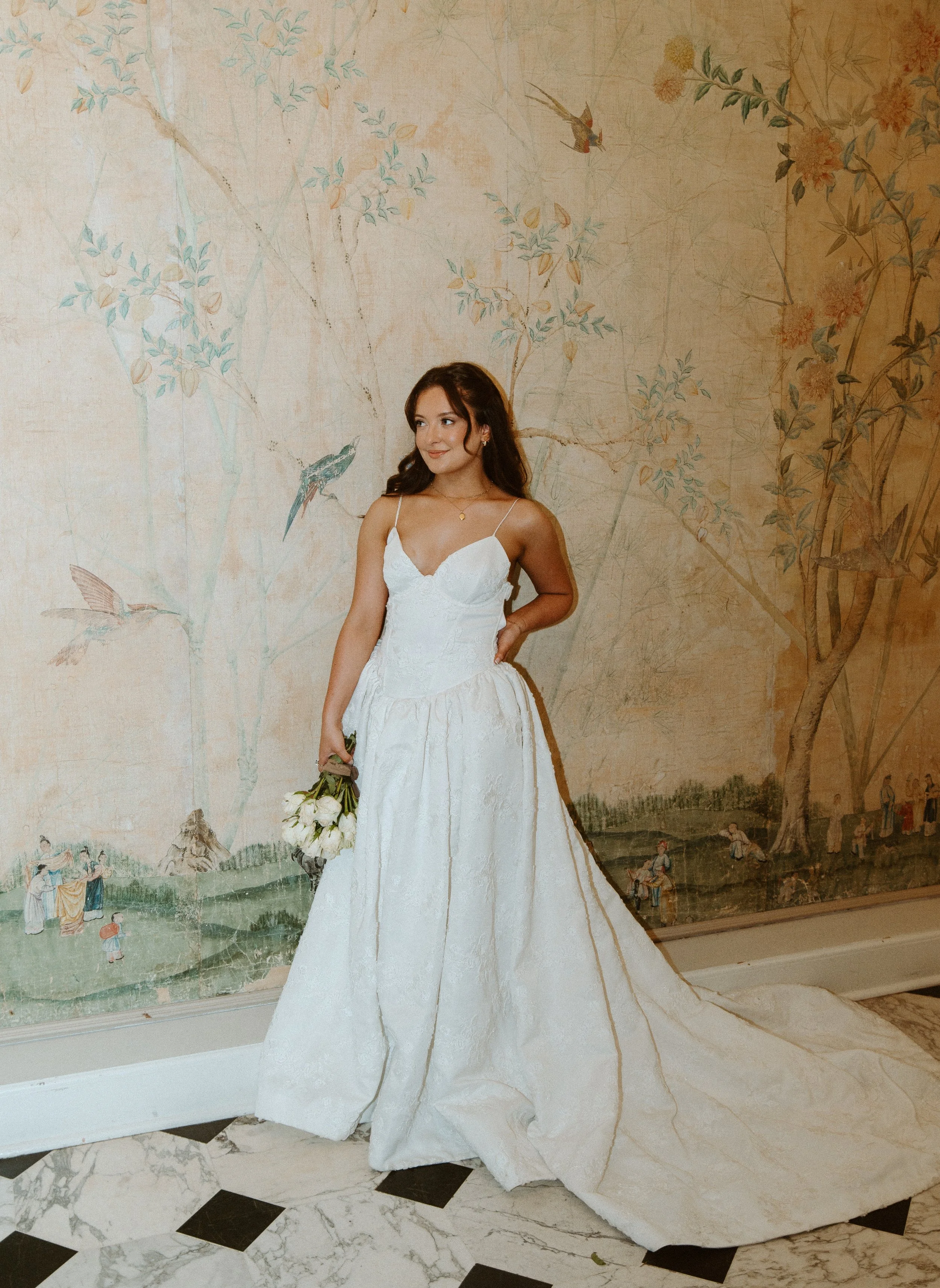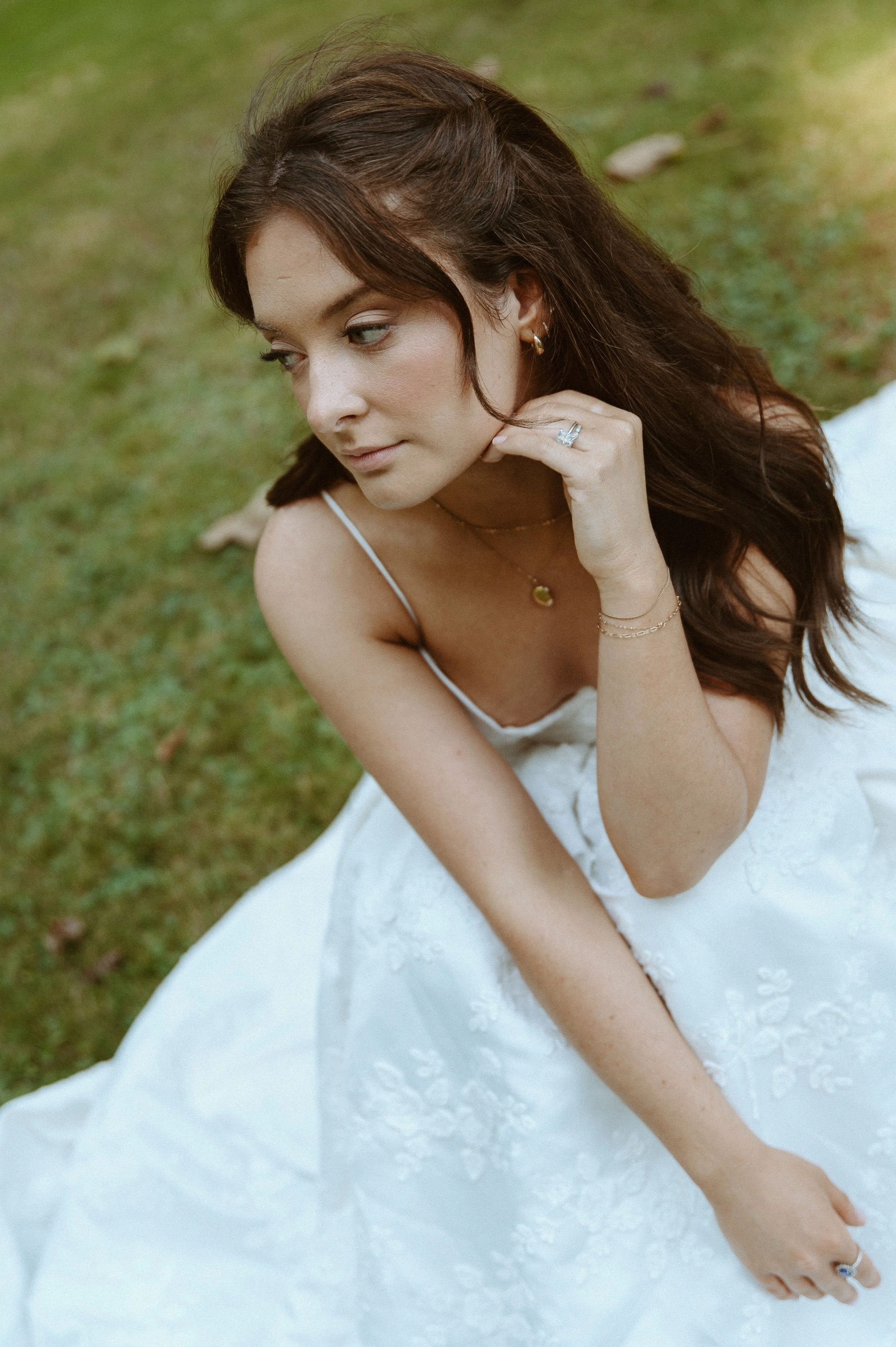 The bride wore a timeless gown adorned with delicate floral patterns, creating a beautiful connection between her look and the lush garden surroundings. The floral detailing added a soft, whimsical elegance , the perfect touch for a garden inspired shoot.