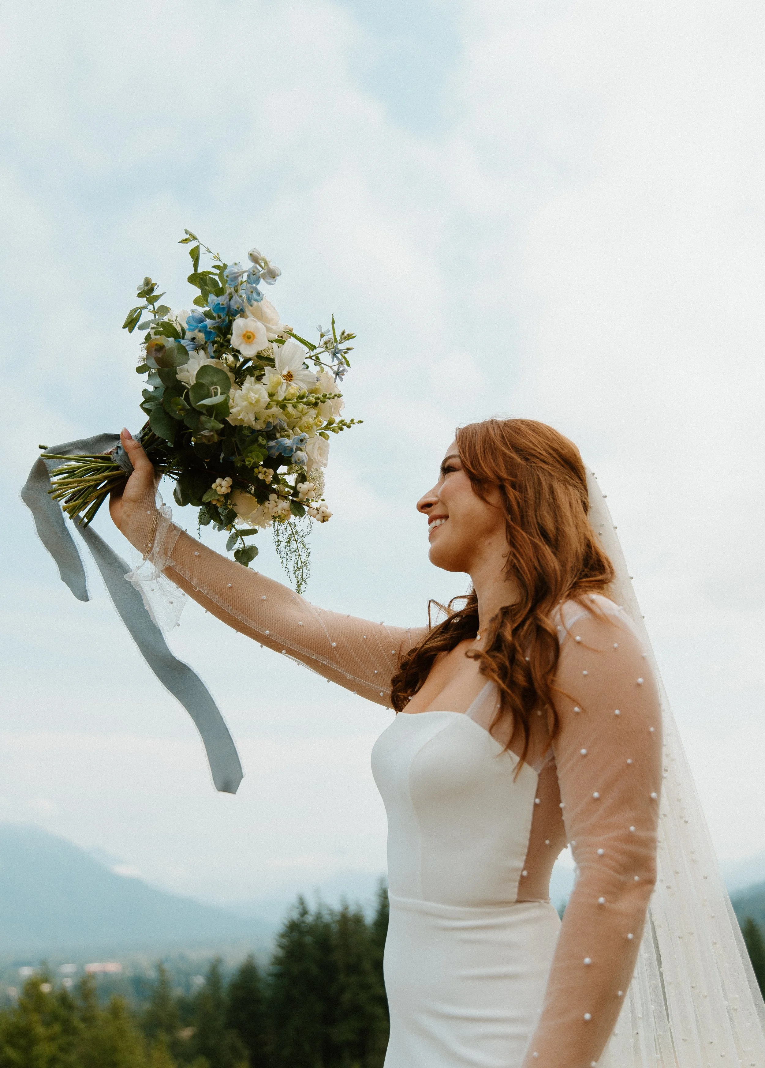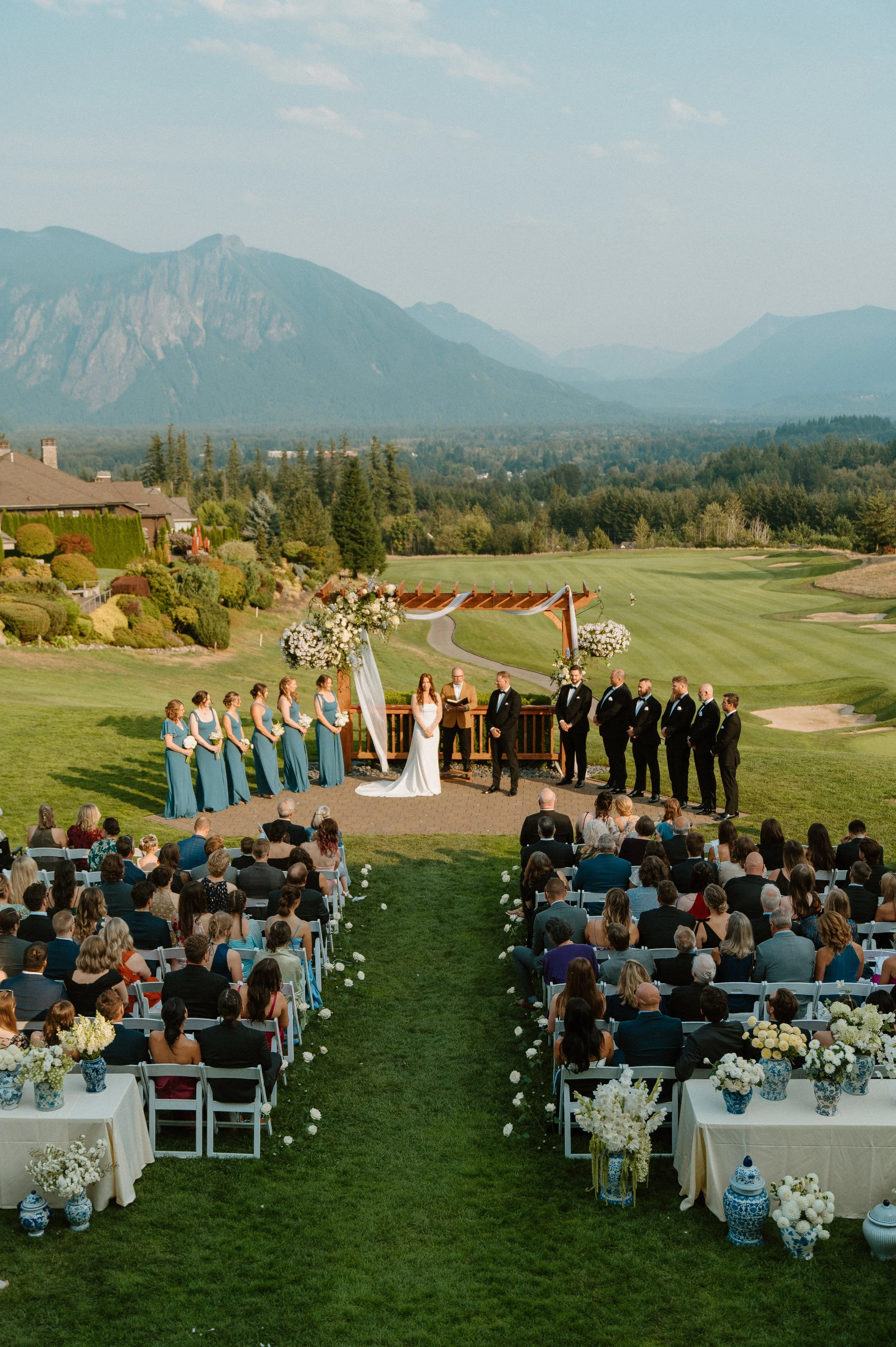 There are some weddings that feel like they’re plucked straight from a movie scene , soft mountain air, sweeping views, and a couple so in love it almost doesn’t feel real. This gorgeous celebration at The Club at Snoqualmie Ridge was exactly that. Nestled in the heart of the Pacific Northwest, this venue gave us the most breathtaking backdrop: rolling greens, tall evergreens, and hazy blue mountains wrapping around the horizon. Truly a PNW dream.