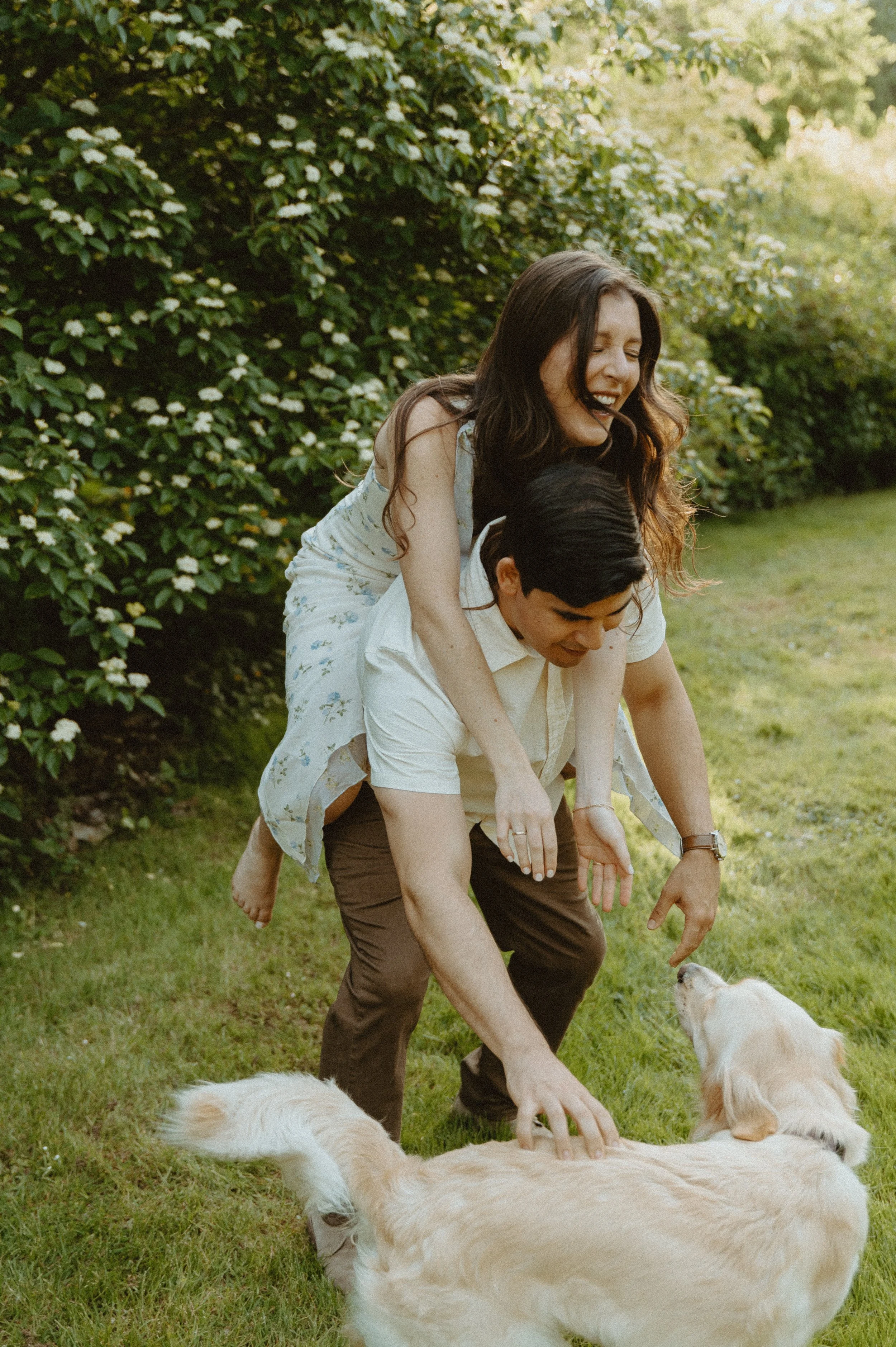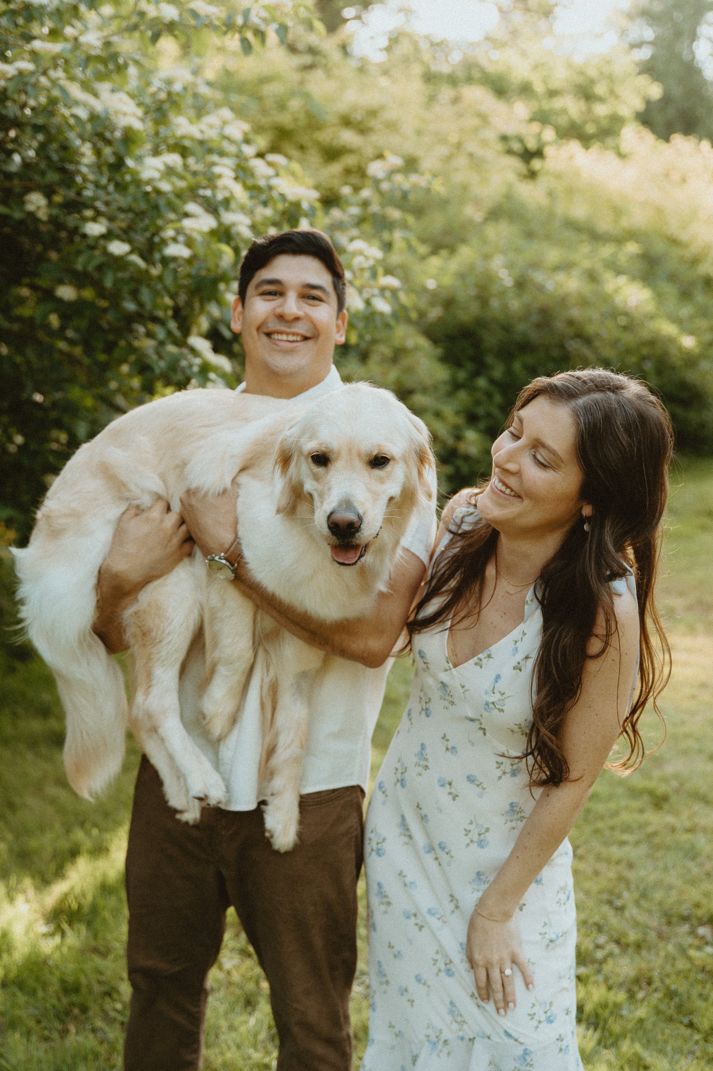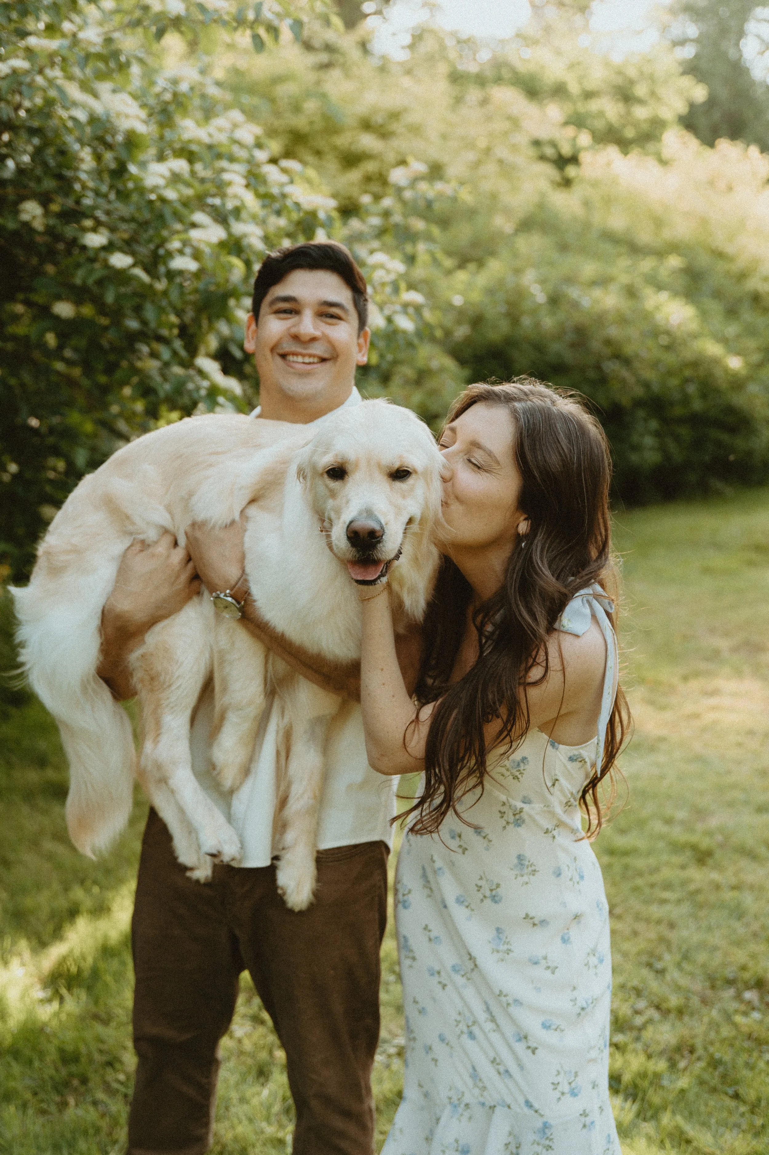 Seattle Garden Engagement Photos with Their Sweet Golden Retriever . Romantic & Natural PNW Session