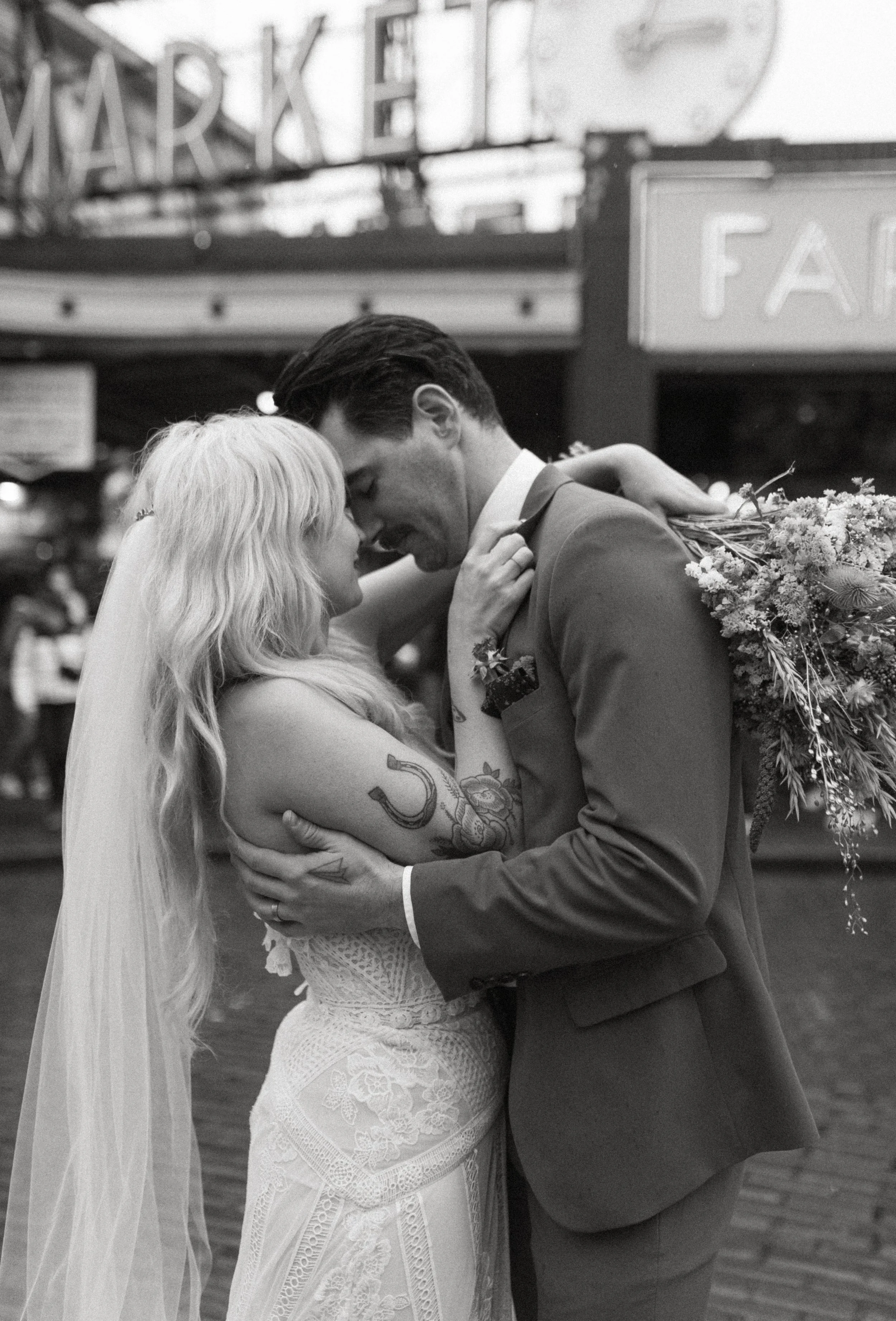 This styled elopement near Pike Place Market was everything I love about photographing love stories in the city. The streets were alive, the sky was soft and overcast, and the quiet in-between moments felt even more intimate surrounded by the movement of the city.