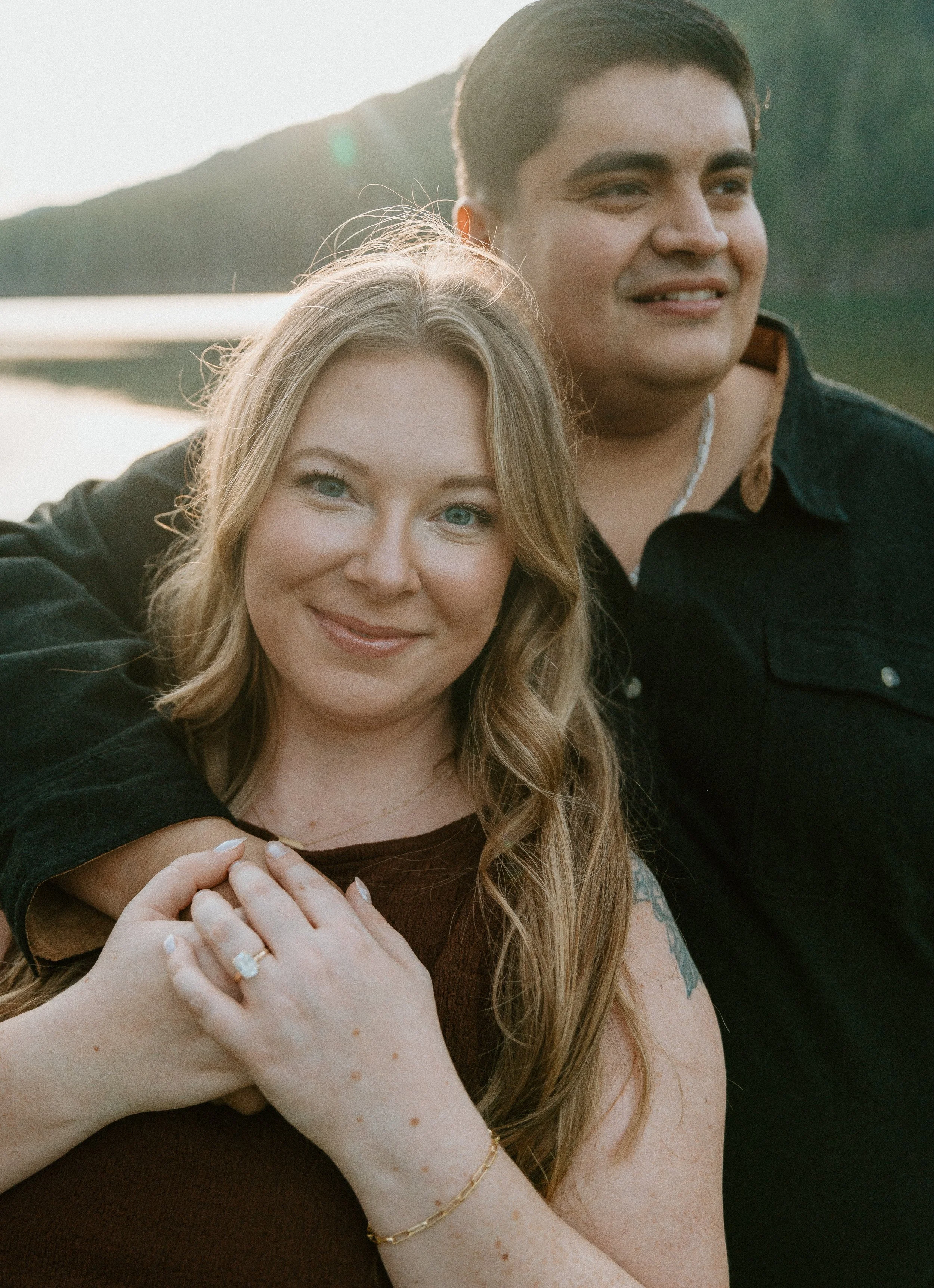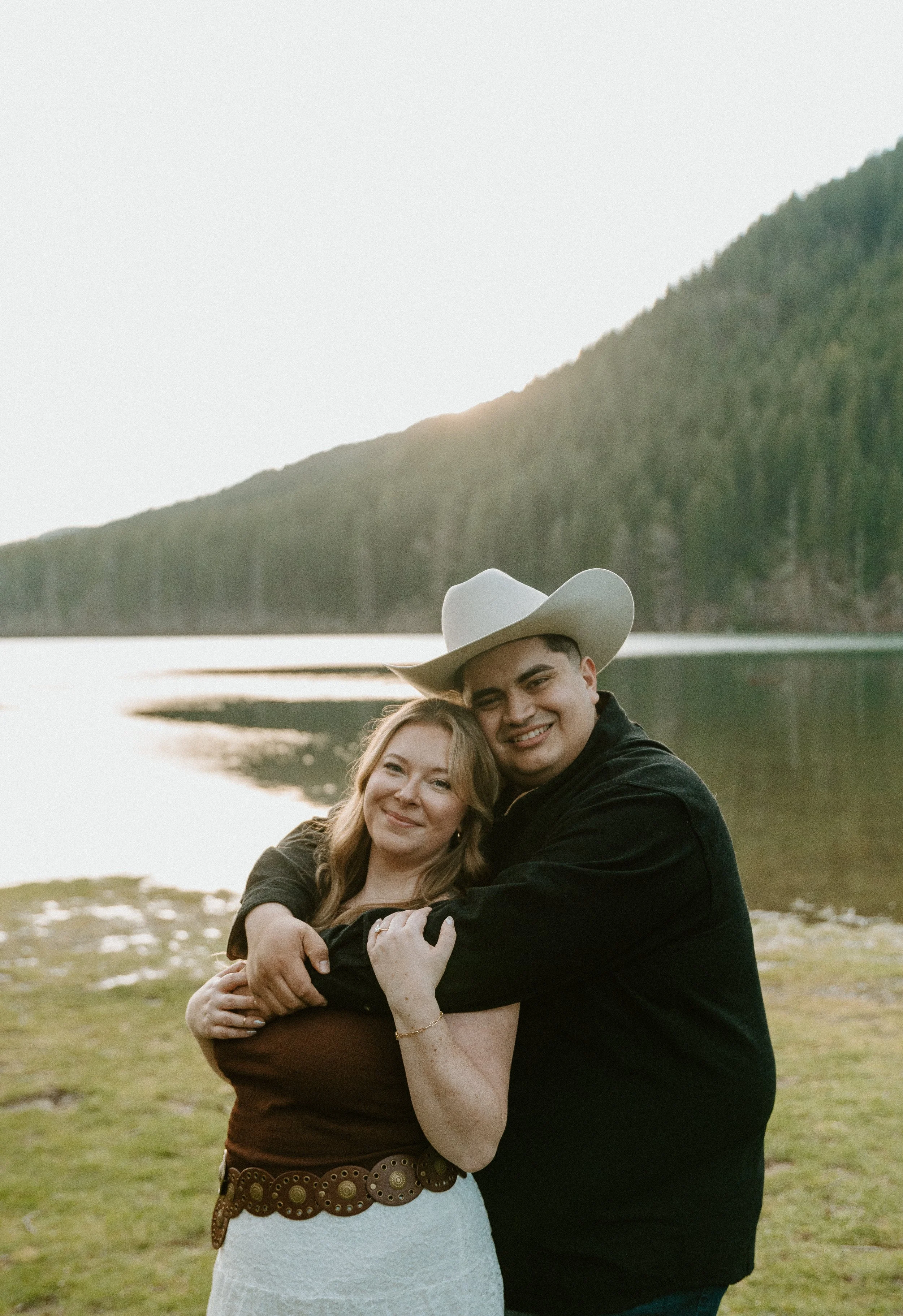 We chose a beautiful lakeside location in North Bend, Washington, which is one of my favorite spots for engagement sessions in the PNW. The combination of water, mountains, and open space makes it perfect for couples who want a mix of scenic and intimate.