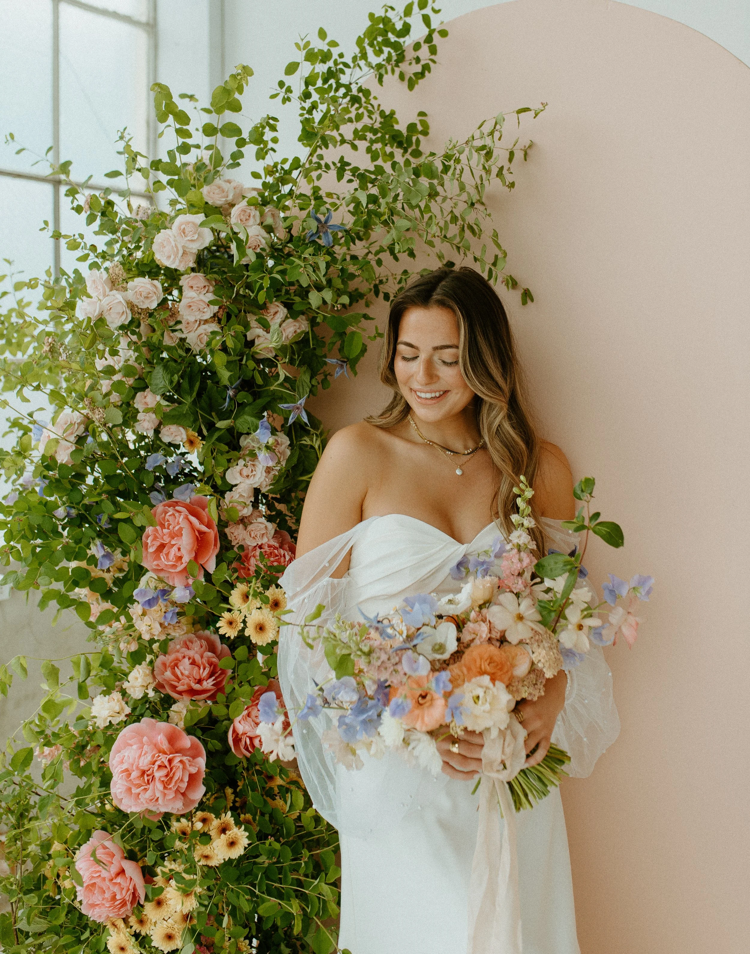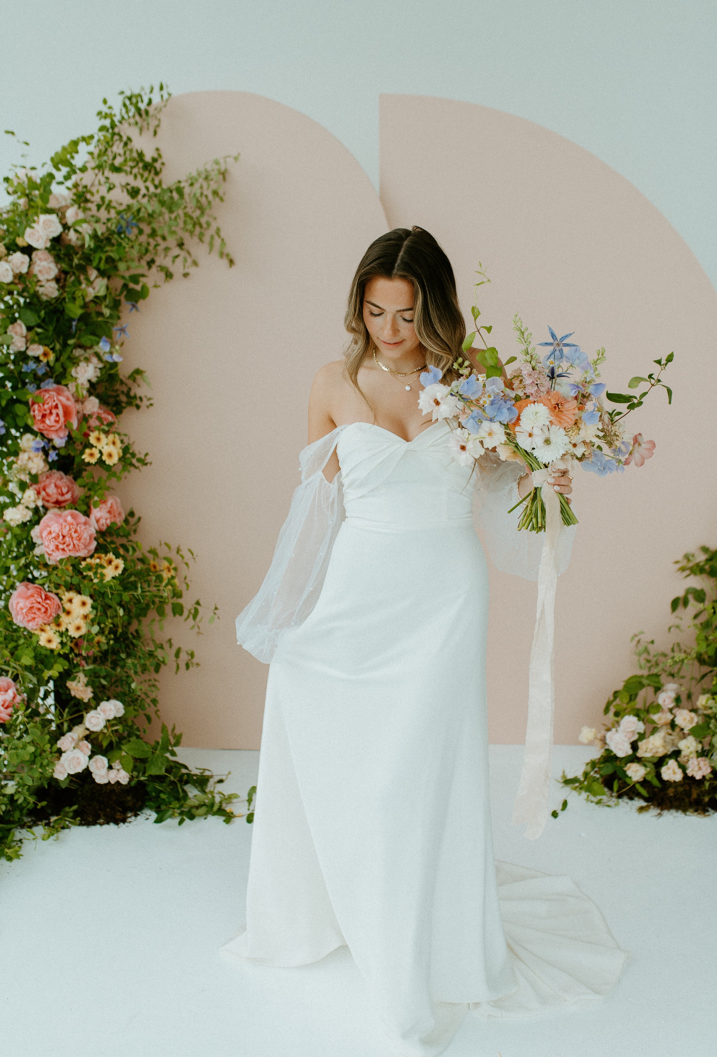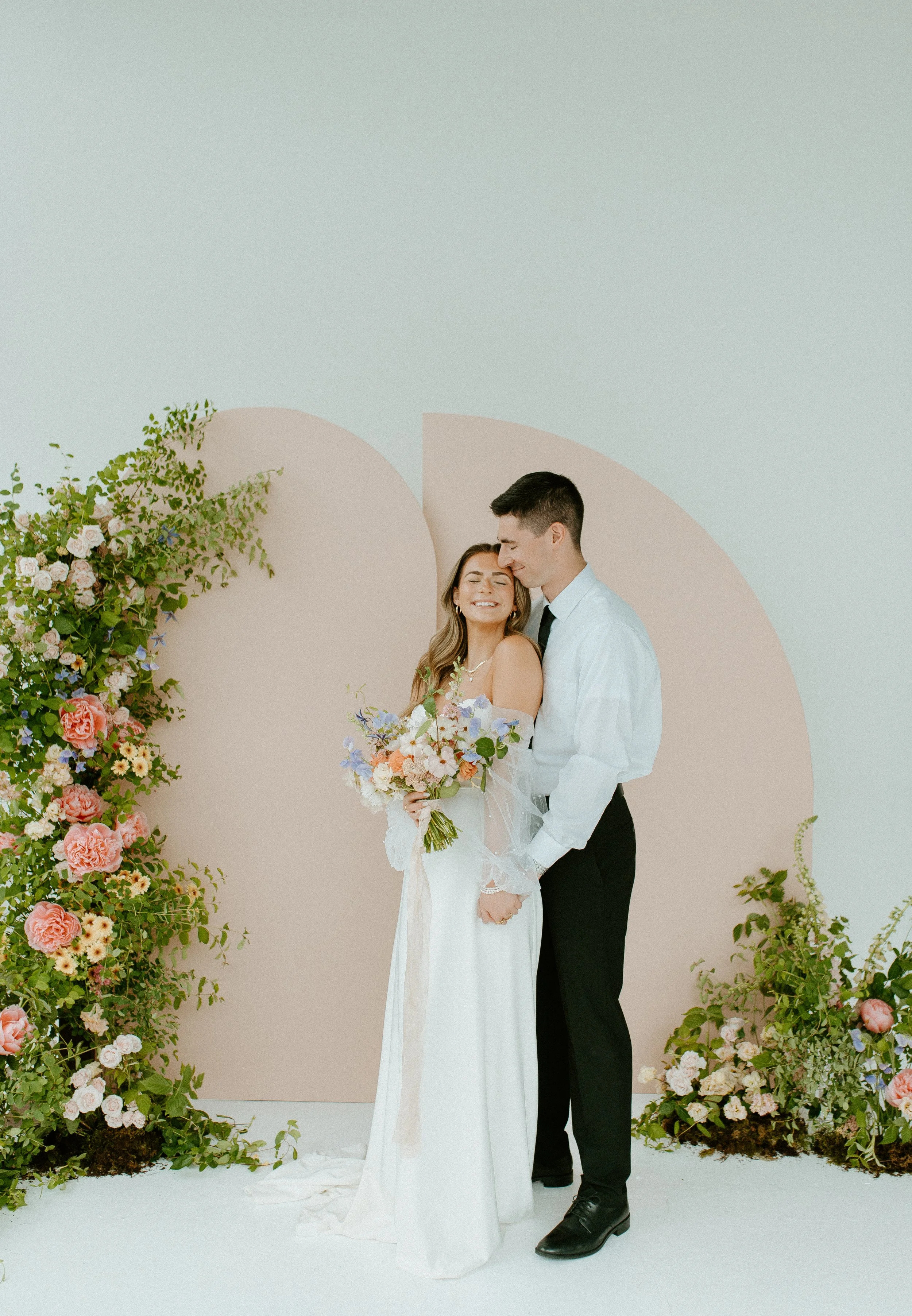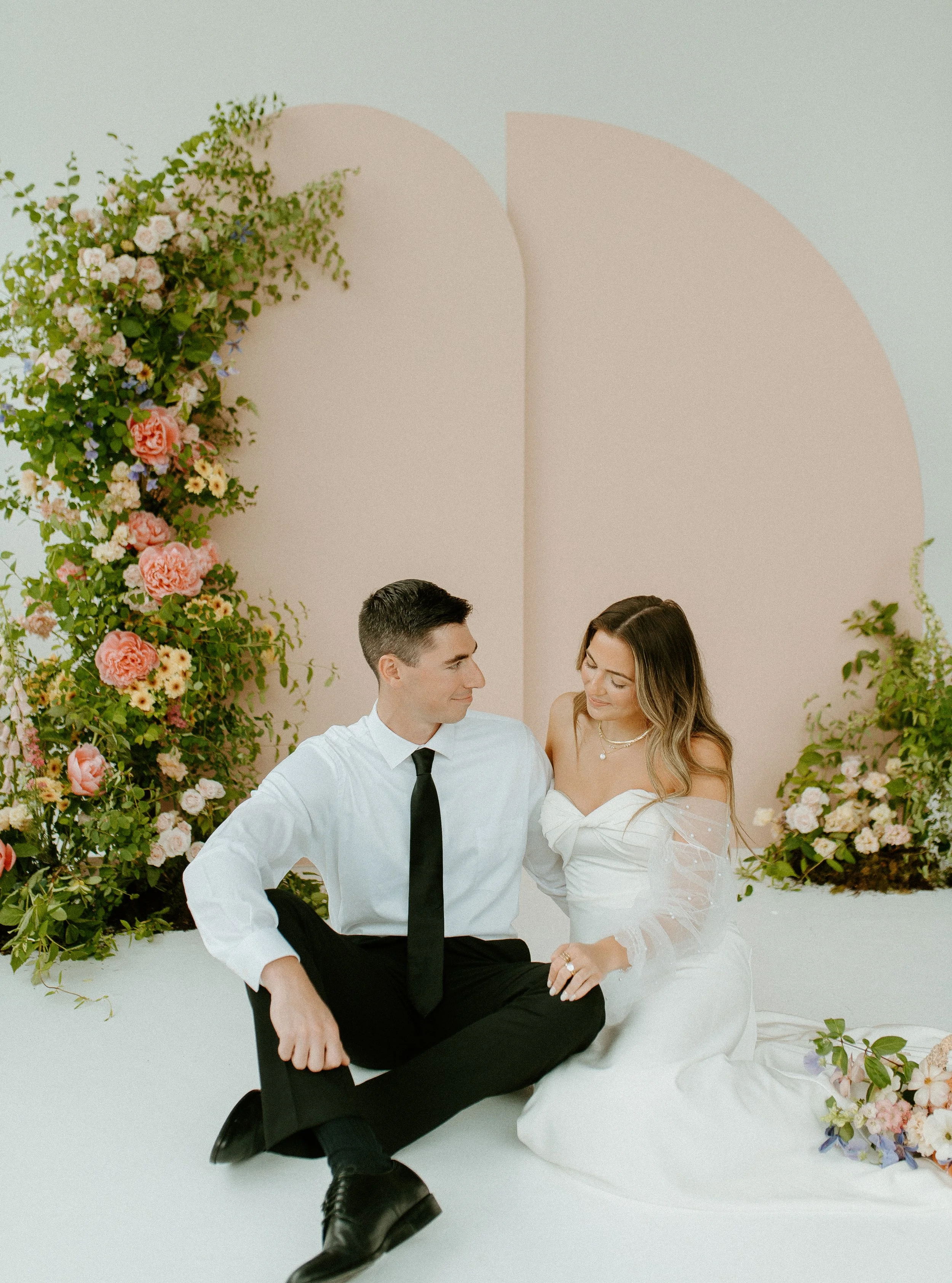 This styled bridal shoot in a Seattle studio was the perfect blend of modern simplicity and soft, romantic details. The neutral backdrop allowed every element to stand out in the most subtle way, from the delicate textures of the gown to the organic, garden-inspired florals that framed the couple so naturally.